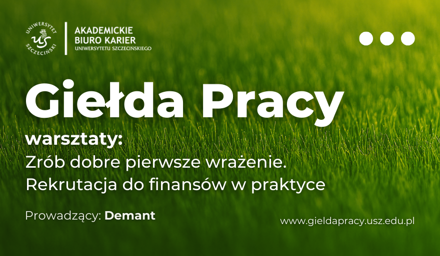 sala 127, Wydział Ekonomii, Finansów i Zarządzania, ul. Mickiewicza 64.Akademickie Biuro Karier wraz z firmą Demant zapraszają na praktyczne zajęcia, które odbędą się 24 marca 2026 r. w godzinach 10:00–12:00 na Wydziale Ekonomii, Finansów i Zarządzania Uniwersytetu Szczecińskiego w ramach Giełdy Pracy. Warsztat "Zrób dobre pierwsze wrażenie. Rekrutacja do finansów w praktyce" pokaże Ci, jak przygotować się do rozmowy o pracę w działach finansowych i zrobić […]