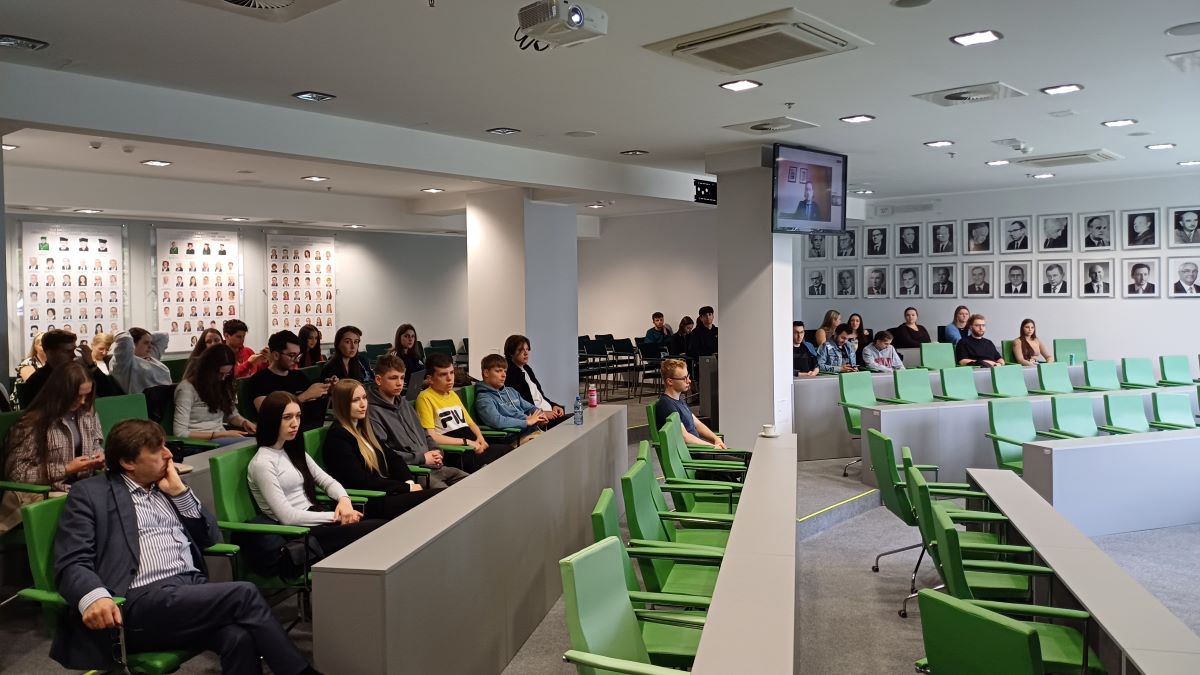 Spotkanie studentów i wykładowców w sali wykładowej.