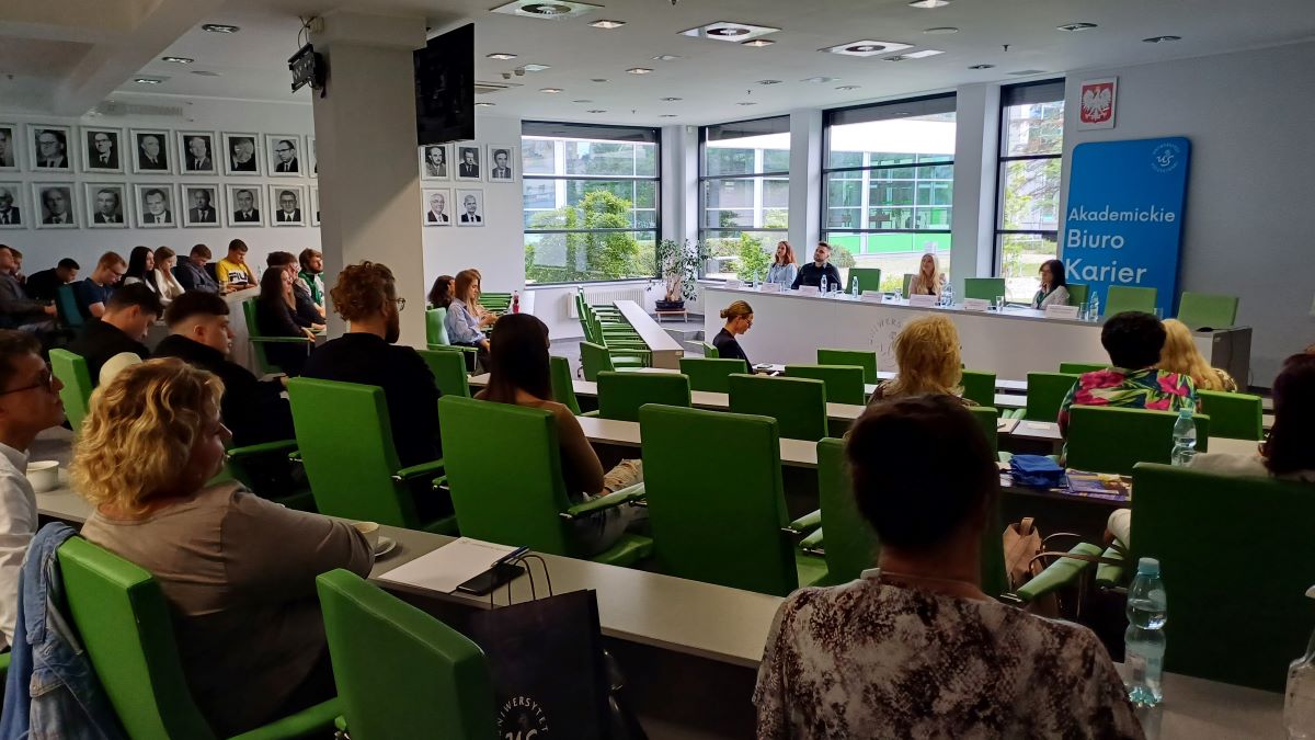 Spotkanie studentów i wykładowców w sali wykładowej.